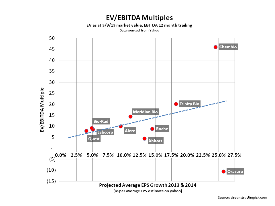 Generally, the entire Diagnostic Industry is set to gain from the ageing population and a rising demand for rapid test evaluations. TRIB has some core product catalysts over the next few years including the ramping up of sales of the Premier instruments for diabetes, its new cardiac product portfolio from Fiomi, a new range of POC products, and now the Immco acquisition. Gross margins are around a healthy 50% with net operating margins around 20%. With no debt and a healthy cash pile (albeit a reduced one to about $30 million after the Immco acquisition), TRIB’s valuation has screamed ahead. The graph below shows its current EV/EBITDA multiple (adjusted for Immco purchase) against its peers using the analyst expected EPS growth from 2012 to 2014 (sourced from yahoo).