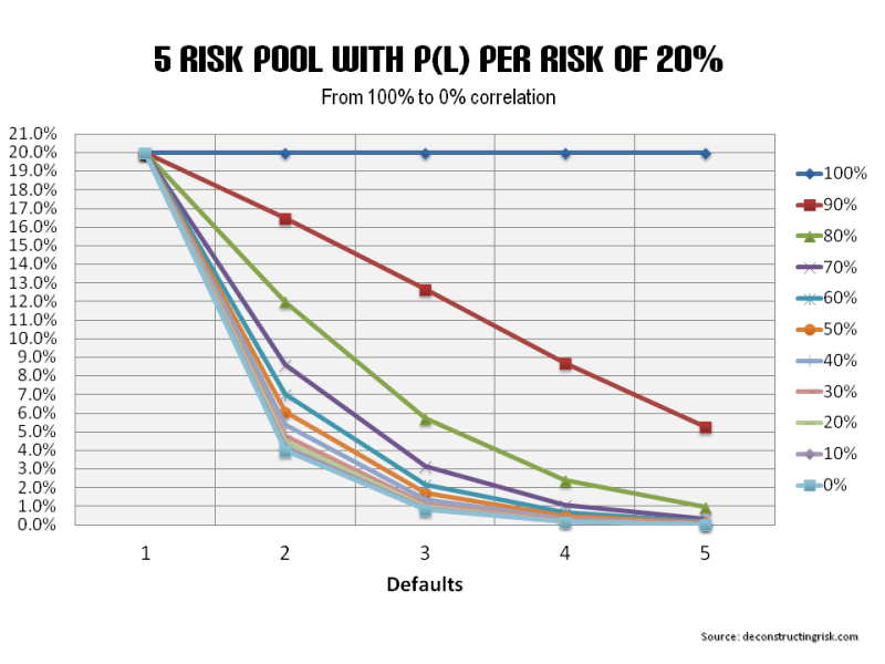 5 risk pool with correlations from 100% to 0%