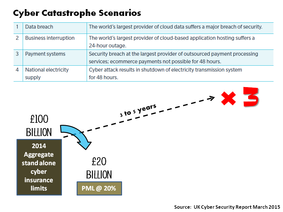On the topic of a probable maximum loss (PML) for the insurance sector, the report uses a fairly unscientific 20% of the estimated 2014 aggregate limit of £100 billion, based upon industry expert judgment, as a guesstimate.