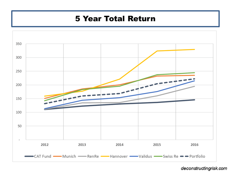5 Year Total Returns CAT Bonds vrs Reinsurer Equity