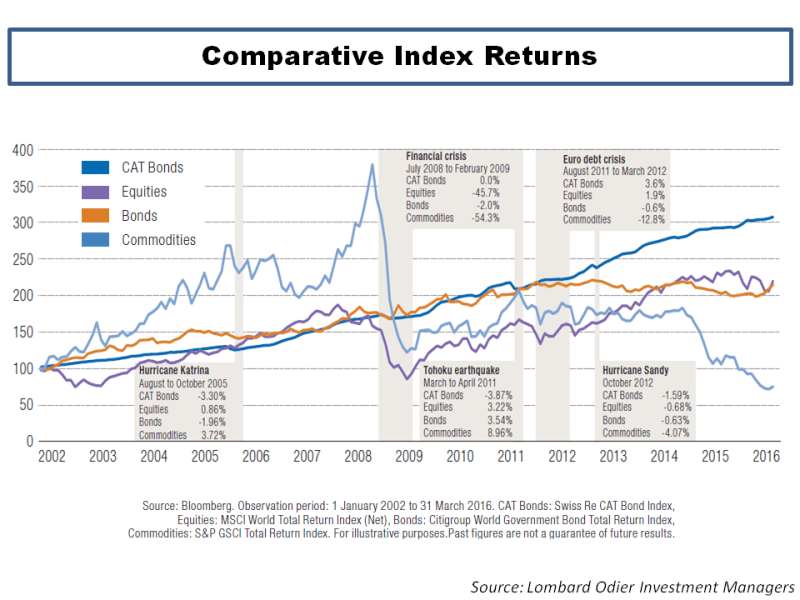 CAT Bond Returns vrs MSCI vrs Gov Bonds vrs Commodities