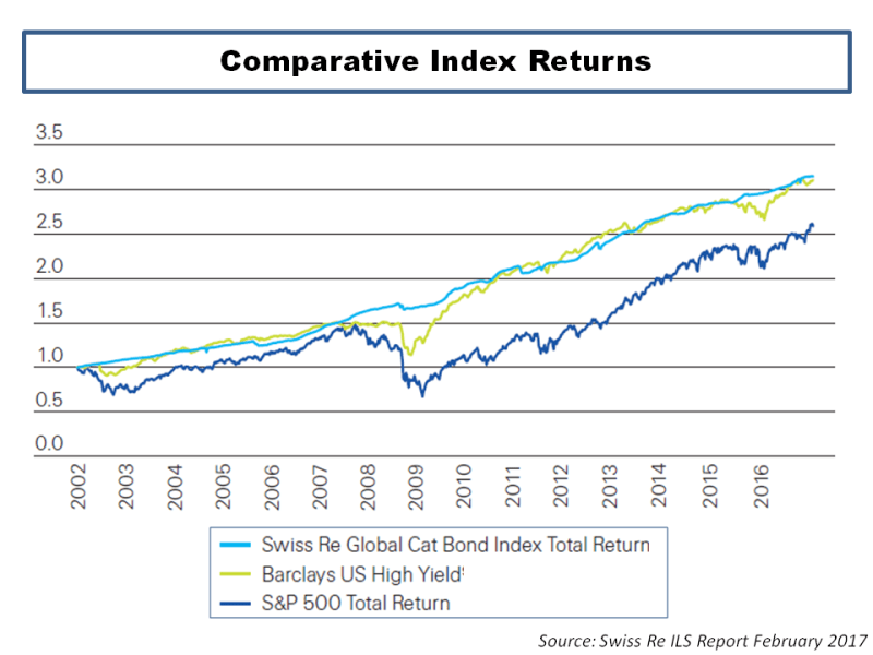 CAT Bond Returns vrs SP500 vrs High Yield
