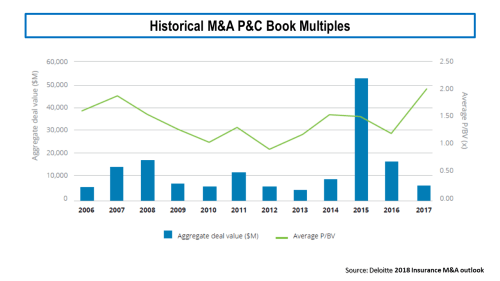 It’s been a while since I posted on the specialty insurance sector and I hope to post some more detailed thoughts and analysis when I get the time in the coming months. M&A activity has picked up recently with the XL/AXA and AIG/Validus deals being the latest examples of big insurers bulking up through M&A. Deloitte has an interesting report out on some of the factors behind the increased activity. The graph below shows the trend of the average price to book M&A multiples for P&C insurers.