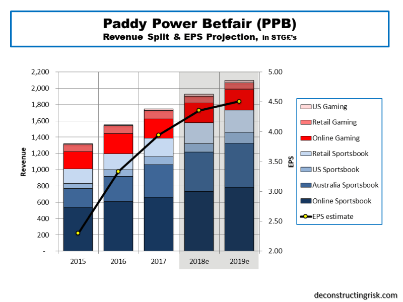 Paddy Power Betfair 2015 to 2019 Revenue Split & EPS projection