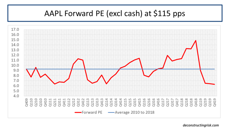 AAPL Forward 12 Month PE Ratio excl cash using 2019 and 2020 estimates Jan2019
