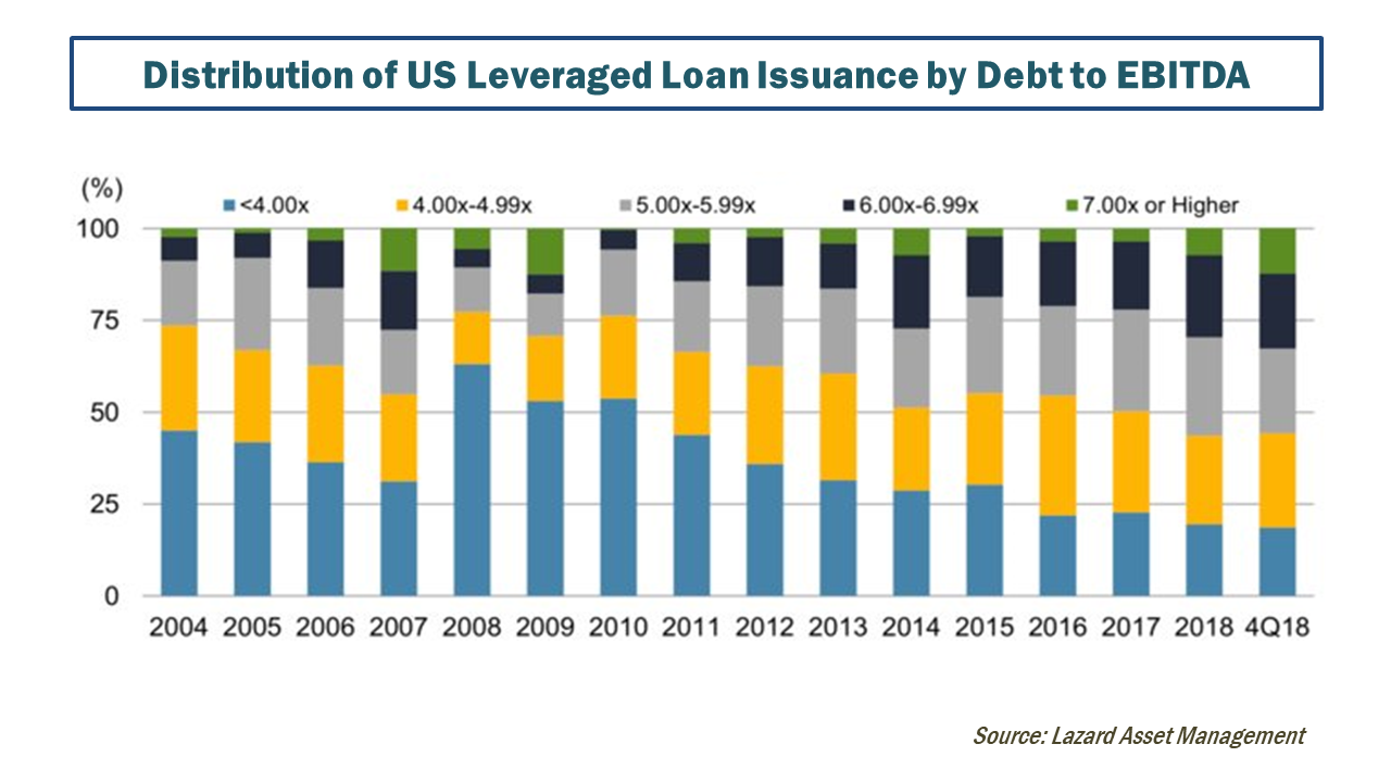 According to Ron Temple of Lazard Asset Management the “deterioration in underwriting standards for leveraged loans is increasingly worrisome” and the graph below shows the increased leverage in the market which combined with lax terms (approx. 80% are covenant lite loans) are a red flag in the event of any downturn.