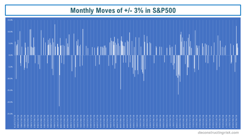 As to what happens next, I have no idea. Some say at 17 times forward earnings; the market is not too expensive, and a wall of money will fuel this FOMO (fear of missing out) rally. Although the positive narrative from Q1 earnings will likely dictate short term trends, the market just feels like it has gotten ahead of itself to me and I feel comfortable taking some money off the table. As the graph below of monthly moves greater than +/- 3% shows, volatility is never that far away.