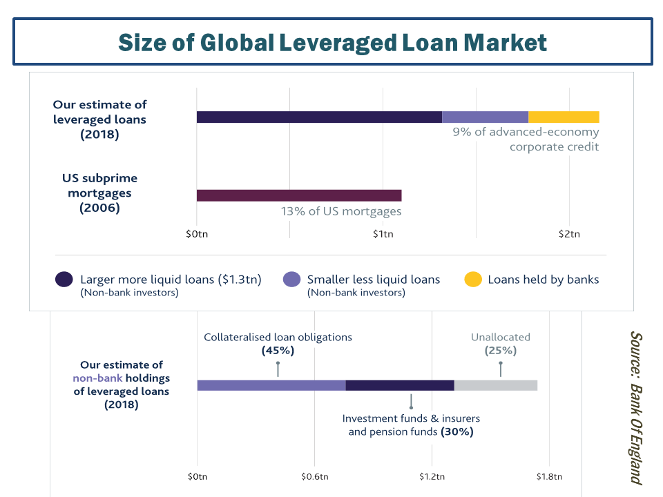 According to a recent report from Euler Hermes, the non-bank leveraged loan market is flattering the overall US corporate debt profile and corporate spreads are likely under estimating risk. This report from Moodys suggests that high leverage is offset by ample coverage of net interest expense. In this report, S&P estimate that “the proportion of companies having aggressive or highly leveraged financial risk has risen slightly to 61% (compared to 2009)”. Regulators also remain concerned about debt levels, particularly leveraged loans as per this recent report. The size of the leveraged loan market globally is estimated around $1.5 trillion, with the Bank of England estimates shown below.
