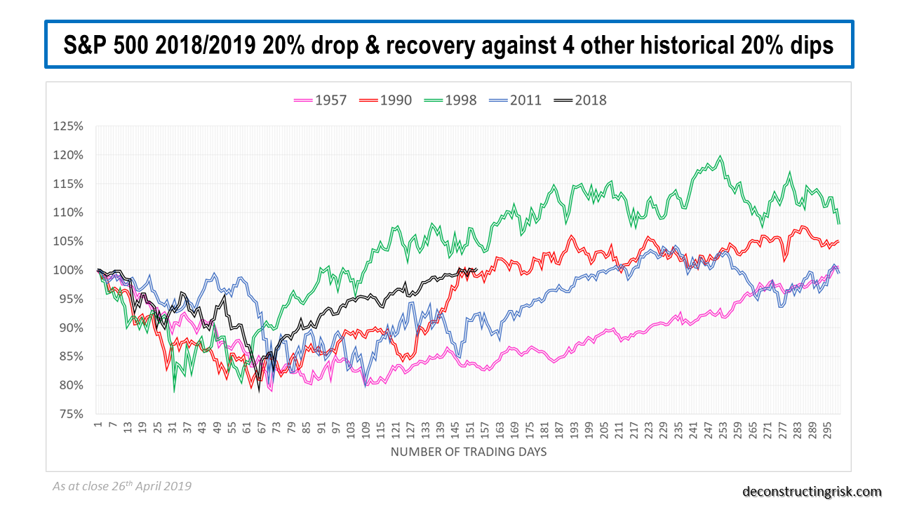Some commentators are bullish on more upside for the market on the improved economic and earnings figures and cite comparisons to similar 20% drops and recoveries in 1998 and 2011. The graph below shows the comparisons, with 2 other 20% drops (although 1957 and 1990 were during recessions).