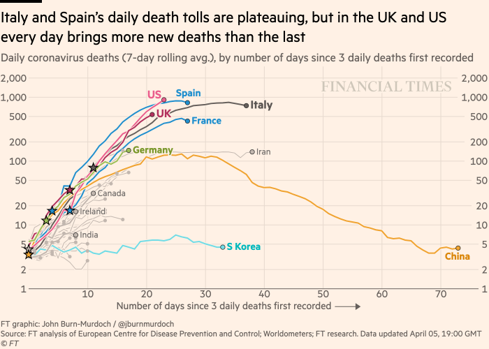 As many people grapple with the current uncertainties presented by this pandemic, we are currently at peak uncertainty in Europe and the US. We are only now getting a sense of how the outbreak is peaking in Europe given the lock down measures in place. How the virus reactions to the relaxation of current measures, how the outbreak will peak across the US and other continents, the economic impact of the outbreak, or the societal impact amongst many other issues are as yet unknown. We do know however that with time over the coming weeks some of these answers will become clearer. For example, as the graph below from the FT shows, we known the approximate path of the outbreak given the policies being pursued today.