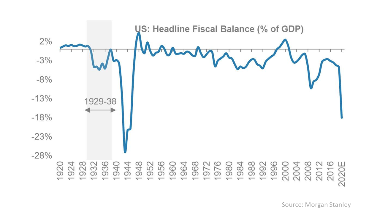 The economic impacts are highly uncertain but will become clearer as the weeks pass. For example, with just the first fiscal stimulus package passed in the US, the politicians are already listing their priorities for the second (and likely not to be the last either), Morgan Stanley expect the cyclically adjusted primary fiscal deficit to rise to 14% of GDP and the headline fiscal deficit at 18% of GDP in 2020, as per their graphic below. Given the unknown impact of the crisis on GDP numbers, these percentages could approach 15% to 20% with total debt of 110% to 120%. It’s depressing to note that prior to this crisis the IMF said the U.S. debt-to-GDP was already on an unsustainable path.