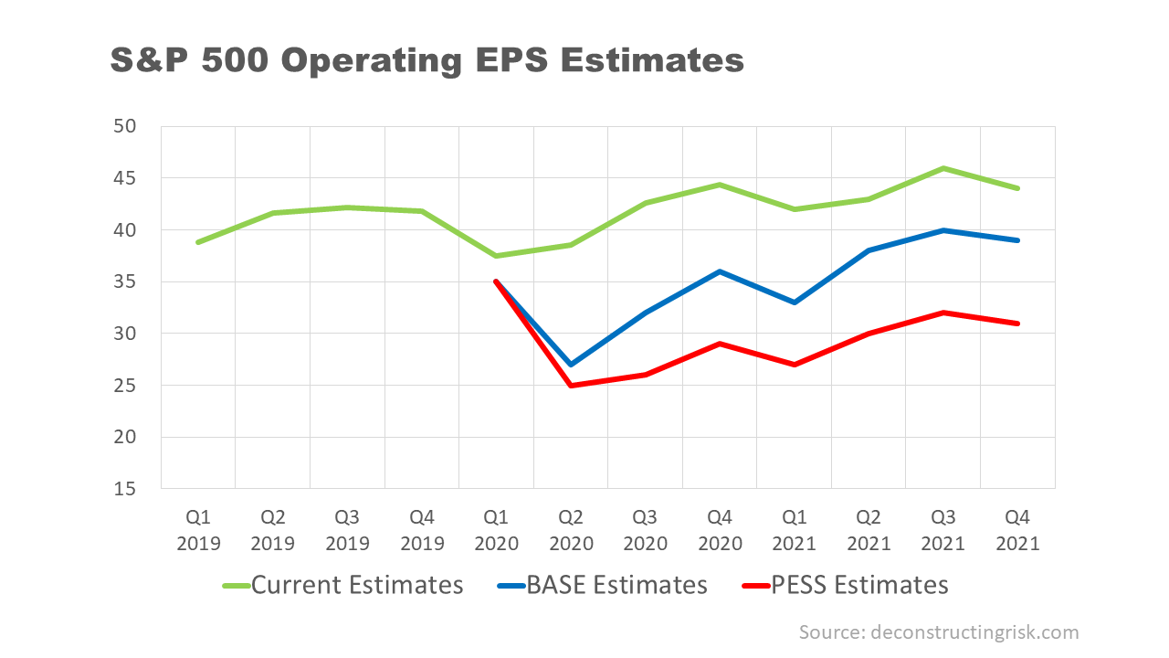 Using unscientific guesses on my part, I have estimated base and pessimistic operating EPS figures for the S&P500 as below. Based upon a forward PE (on a GAAP EPS) of 15 (approx. 12.75 on operating EPS basis), which is the level reached after the dot com bubble and the financial crisis, the resulting level for the S&P500 is 2,000 and 1,600 in the base and pessimistic scenarios respectively. That’s a further 20% and 35% drop from today’s levels respectively.