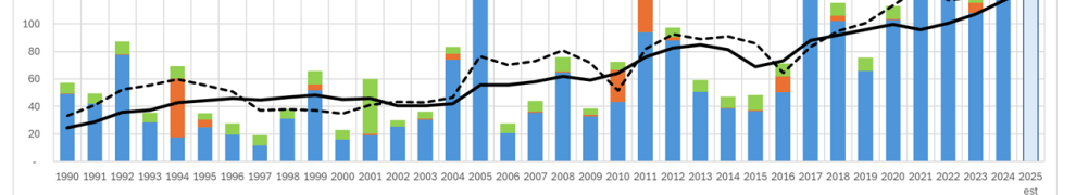 Anyway, the below exhibit updates the inflated insured catastrophe losses from 1990 to 2024 (with Swiss Re’s estimate for 2025). The trend is clearly upwards with the new 10-year average at $130 billion and the 5-year average at $140 billion. This is a significant change from the $60 billion 10 year average in the 2013 post!