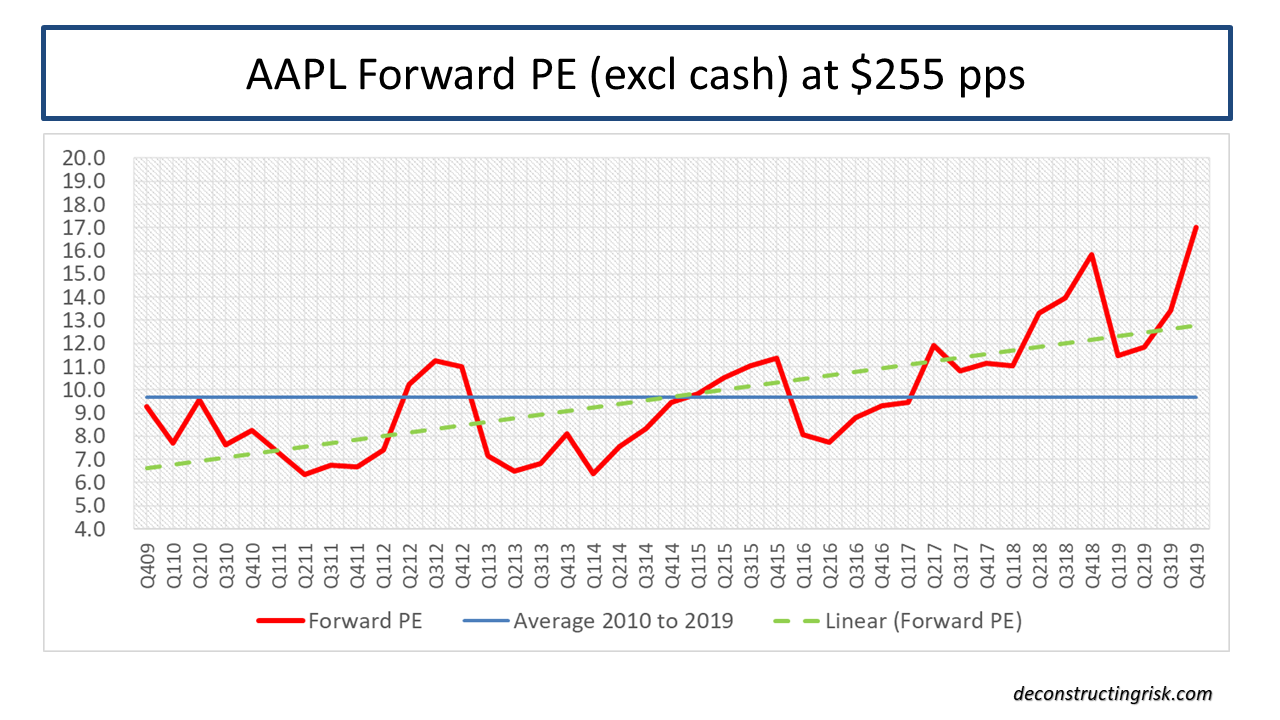 In terms of valuation, if I stick with my trusted AAPL valuation methodology of the forward PE excluding cash ratio analysis, using my EPS estimates for 2020, the stock is currently trading around a 17 PE, approximately 75% above the 10-year average! If I revert to the bull thesis (held before the meltdown late last year) that the market has recognised that AAPL is not purely a hardware firm any longer and deserves a hybrid hardware/software rating to reflect its growing services business, the current price is approximately 30% above the fitted trend line (as a proxy for the hybrid valuation), as below. I will have to come up with a better hybrid valuation methodology in the future but it’ll do for now (all ideas welcome on that front!).