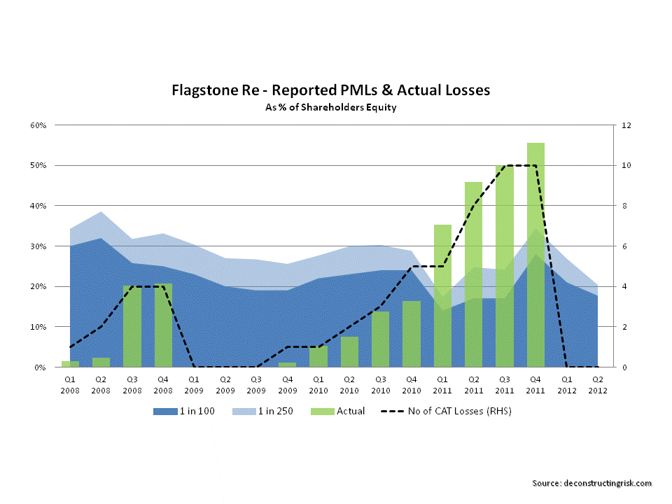 To finish, I have reproducing the graph on Flagstone Re from the June 2013 post as it speaks a thousand words about the dangers of relying too much on the published PMLs. Published PMLs are, after all, only indicators of losses from single events and, by their nature, reflect current (group) thinking from widely used risk management tools.