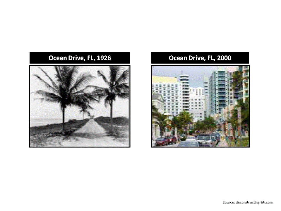 Historical Insured Losses (click to enlarge)1990 to 2012 historical insured catastrophe losses Swiss ReThe reality is that as the world population increases resulting in higher housing density in catastrophe exposed areas such as coast lines the past needs to be viewed in terms of todays exposures. Pictures of Ocean Drive in Florida in 1926 and in 2000 best illustrates the point (click to enlarge).