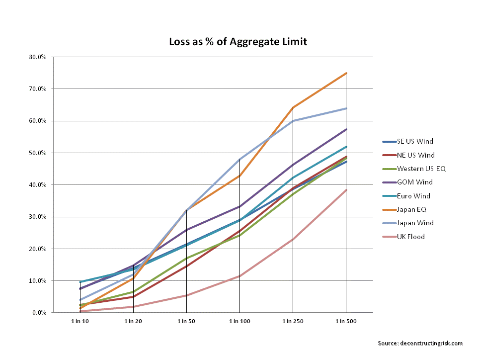 Given the uncertainties around reported PMLs discussed in this post, I particularly like seeing PMLs as a percentage of aggregate limits. In the days before the now common use of catastrophic models (by such vendor firms as RMS, AIR and Eqecat), underwriters would subjectively calculate their PMLs as a percentage of their maximum possible loss or MPL (in the past when unlimited coverage was more common an estimate of the maximum loss was made whereas today the MPL is simply the sum of aggregate limits). This practise, being subjective, was obviously open to abuse (and often proved woefully inadequate). It is interesting to note however that some of the commonly used MPL percentages applied for peak exposures in certain markets were higher than those used today from the vendor models at high return periods.