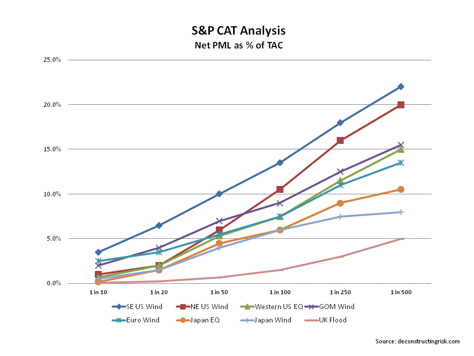 As we head deeper into the US hurricane season, it is worth reviewing the disclosures of a number of reinsurers in relation to catastrophe exposures, specifically their probable maximum losses or PMLs . In 2012 S&P’s influential annual publication – Global Reinsurance Highlights – there is an interesting article called “Just How Much Capital Is At Risk”. The article looked at net PMLs as a percentage of total adjusted capital (TAC), an S&P determined calculation, and also examined relative tail heaviness of PMLs disclosed by different companies. The article concluded that “by focusing on tail heaviness, we may have one additional tool to uncover which reinsurers could be most affected by such an event”. In other words, not only is the amount of the PMLs for different perils important but the shape of the curve across different return periods (e.g. 1 in 50 years, 1 in 100 years, 1 in 250 years, etc.) is also an important indicator of relative exposures. The graphs below show the net PMLs as a percentage of TAC and the net PMLs as a percentage of aggregate limits for the S&P sample of insurers and reinsurers.