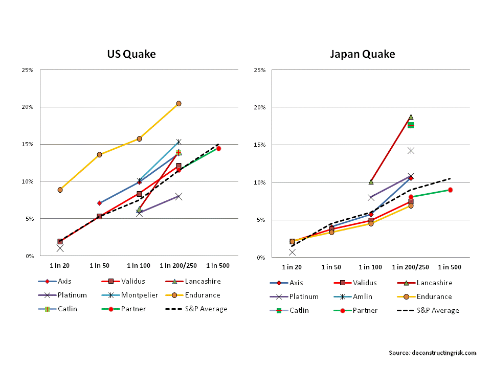 As per the S&P article, its important to look at the shape of PML curves as well as the levels for different events. For example, the shape of Lancashire PML curve stands out in the earthquake graphs and for the US gulf of Mexico storm. Montpelier for US quake and AXIS for Japan quakes also stand out in terms of the increased exposure levels at higher return periods. In terms of the level of exposure, Validus stands out on US wind, Endurance on US quake, and Catlin & Amlin on Japan quake.