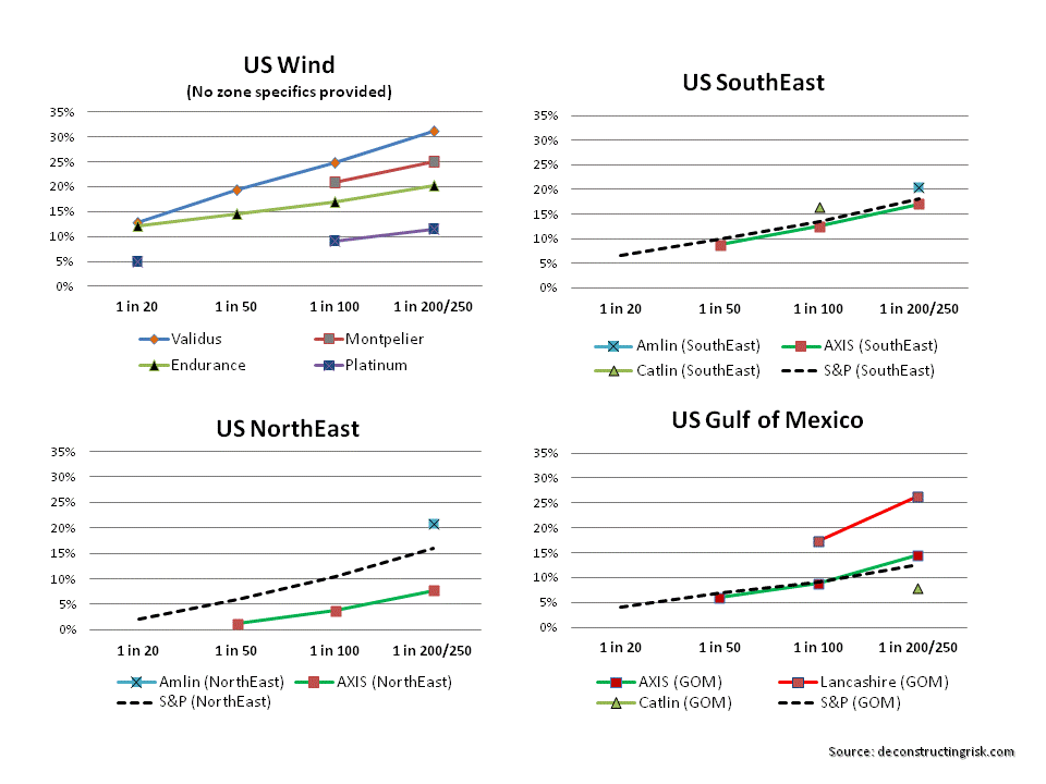 As per the June 2013 post, firms often classify their US wind exposures by zone but I have taken the highest exposures for each (which may not necessarily be the same zone for each firm).