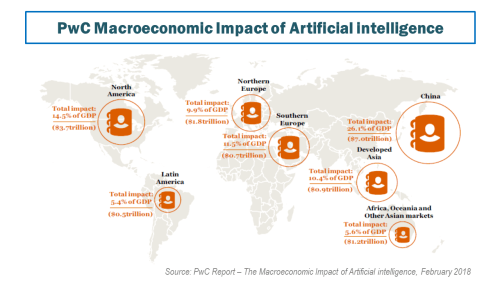 In 2016, Accenture estimated that US GDP could be $8.3 trillion higher in 2035 because of AI, doubling growth rates largely due to AI induced productivity gains. More recently in February this year, PwC published a report on an extensive macro-economic impact of AI and projected a baseline scenario that global GDP will be 14% higher due to AI, with the US and China benefiting the most. Using a Spatial Computable General Equilibrium Model (SCGE) of the global economy, PwC quantifies the total economic impact (as measured by GDP) of AI on the global economy via both productivity gains and consumption-side product enhancements over the period 2017-2030. The impact on the seven regions modelled by 2030 can be seen below.