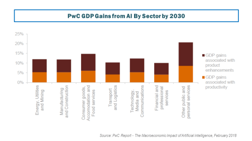 In terms of sectors, PwC estimate the services industry that encompasses health, education, public services and recreation stands to gain the most, with retail and wholesale trade as well as accommodation and food services also expected to see a large boost. Transport and logistics as well as financial and professional services will also see significant but smaller GDP gains by 2030 because of AI although they estimate that the financial service sector gains relatively quickly in the short term. Unsurprisingly, PwC finds that capital intensive industries have the greatest productivity gains from AI uptake and specifically highlight the Technology, Media and Telecommunications (TMT) sector as having substantial marginal productivity gains from uptaking replacement and augmenting AI. The sectoral gains estimated by PwC by 2030 are shown below.