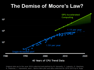 One of the current leaders in specialised chip design is Nvidia (NVDA) who developed software lead chips for video cards in the gaming sector through their graphics processing unit (GPU). The GPU accelerates applications running on standard central processing units (CPU) by offloading some of the compute-intensive and time-consuming portions of the code whilst the rest of the application still runs on the CPU. The chips developed by NVDA for gamers have proven ideal in handling the huge volumes of data needed to train deep learning systems that are used in AI. The exhibit below from NVDA illustrates how they assert that new processes such as GPU can overcome the slowdown in capability from the density limitation of Moore’s Law.