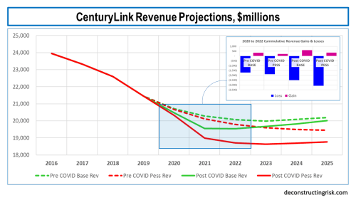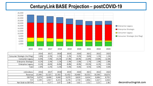 Since that time, CTL made some positive announcements on government EIS contract wins. And of course, the THING happened (more of which later). Just before the Q1 results earlier this month, CTL also announced a change in calculating revenue, to a basis net of USF charges. This is obviously a pain as historical revenue figures (before the quarterly 2019 figures they gave) had to be estimated, based upon the changes in the quarterly USF charges, to get an insight into historical trends. Based upon the revised revenues (net of USF) and giving some credit for new government contracts coming on stream over 2021 and beyond, my revised base projections for CTL, before any COVID19 impact, are below. I did not try to quantify the EIS contracts in dollar terms due to the ambiguities of government contracts; I simply reflected them judgmentally in future percentage changes.
