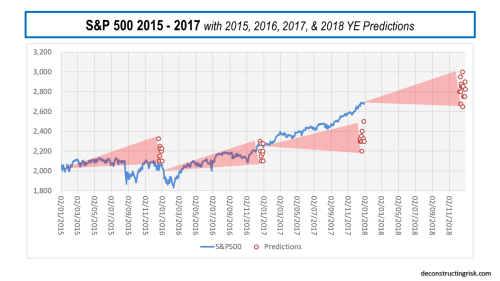 My prediction that “volatility is likely to be ever present” in US markets as the “realities of governing and the limitations of Trump’s brusque approach becomes apparent” also proved to be misguided – the volatility part not the part about Trump’s brusque approach! According to the fact checkers, Trump made nearly 2,000 false or misleading claims in his first year, that’s an average of over 5 a day! Trump has claimed credit for the amazing performance of the 2017 equity market no less than 85 times (something that may well come back to bite him in the years ahead). The graph below does show the amazing smooth performance of the S&P500 in 2017 compared to historical analysts’ predictions at the beginning of the year (see this recent post on my views relating to the current valuation of the S&P500).