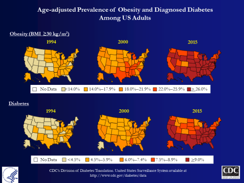 Dr Margaret Chan, the then Director-General of the World Health Organization (WHO), said in a speech in October that “in just a few decades, the world has moved from a nutrition profile in which the prevalence of underweight was more than double that of obesity, to the current situation in which more people worldwide are obese than underweight”. The role of adiposity (a fancy word for fatty body tissue) as an independent risk factor is strongest for diabetes, defined by WHO as fasting blood glucose equal to or higher than 7 mmol/L, or on medication for raised blood glucose, or with a history of diagnosis of diabetes. The global prevalence of diabetes in the adult population has increased dramatically in recent decades, nearly doubling from 4.7% in 1980 to 8.5% in 2014. The increase in the US is frightening, as the graphs below show.