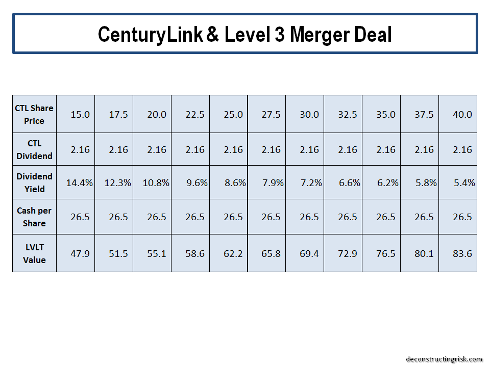 The deal is expected to close in Q3 2017 and includes a breakup fee of about $2 per LVLT share if a 3rd party wants to take LVLT away from CTL. Initially, the market reaction was positive for both stocks although CTL shares have since cooled to $23 (from $28 before the deal was announced) whilst LVLT is around $51 (from $47 before) which is 13% less than the implied takeover price. The consistent discount to the implied takeover price of the deal since it was announced suggests that the market has reservations about the deal closing as announced. The table below shows the implied value to LVLT of the deal shareholders depending upon CTL’s share price.
