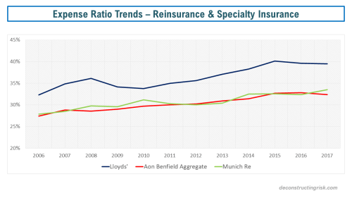 As a reminder of the reinsurance sector’s cost issues, as per this post on Lloyds’, the graph below illustrates the trend across Lloyds’, the Aon Benfield Aggregate portfolio, and Munich’s P&C reinsurance business.