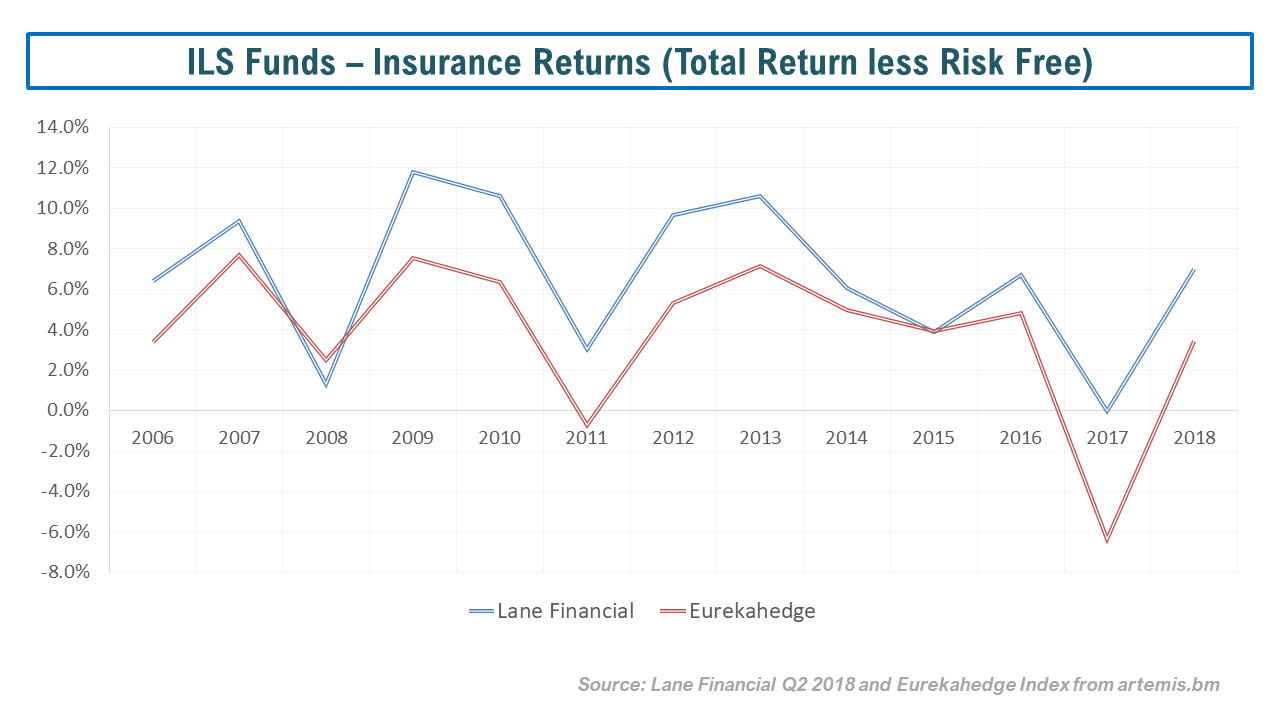 In terms of the returns from ILS funds, the graph below shows the underlying trend (with 2018 results assuming no abnormal catastrophic activity) of insurance only returns from indices calculated by Lane Financial (here) and Eurekahedge (here). Are recent 5 year average returns of between 500 and 250 basis points excess risk free enough to compensation for the risk of a relatively concentrated portfolio? Some think so. I don’t.