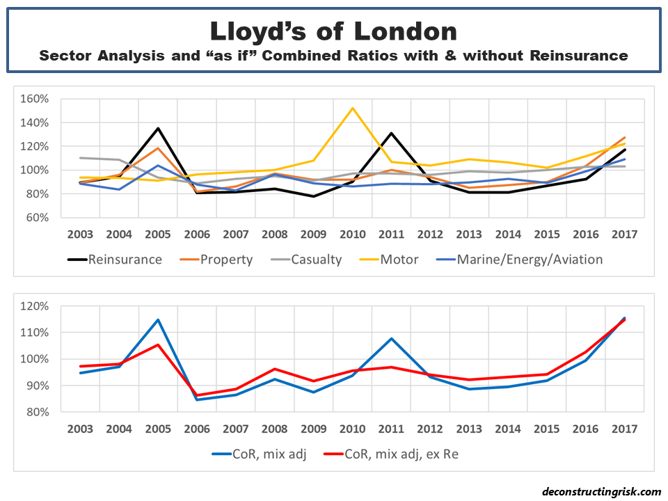 As reinsurance business is commoditised further by ILS, in a prelude to an increase in machine/algorithm underwriting, Lloyd’s business will become less volatile and as a result less profitable. To illustrate, the lower graph below shows Lloyd’s historical weighted average combined ratio, using the 2017 business mix, versus the weighted average combined ratio excluding the reinsurance line. For 2003 to 2017, the result would be an increase in average combined ratio, from 95.8% to 96.5%, and a reduction in volatility, the standard deviation from 9.7% to 7%.