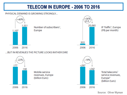 This report from 2017 by Oliver Wyman is one of the better ones and contains some illuminating context for the 5G era. It shows that in Europe despite a 40% annual increase in mobile subscribers and a 36% annual increase in European IP traffic from 2006 to 2016, mobile service revenue and total telecom service revenue decreased by 22% and 19% respectively, as per the graphic below.