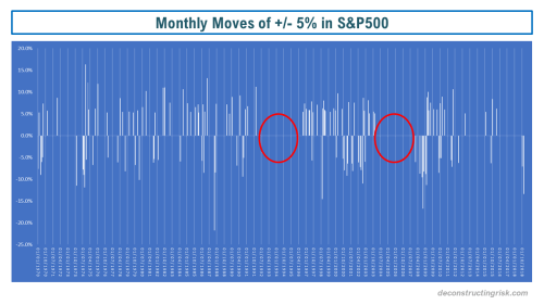 Continuing the theme of trying to end the year on a positive note, if we look at the historical months with moves of +/-5%, as below, it could be argued that the recent volatility is healthy as extended periods of reduced volatility prior to the dotcom bubble and the financial crisis didn’t end well!!