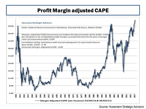 Hussman presents a profit margin adjusted CAPE as of the 3rd of November, reproduced below, which he contends shows that “market valuations are now more extreme than at any point in history, including the 1929 and 2000 market highs”.