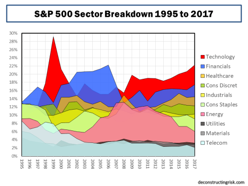 The contribution of technology firms to the bull market, particularly the so-called FANG or FAANG stocks, has also been a much-debated issue of late. The graph below shows the historical sector breakdown of the S&P500 since 1995.