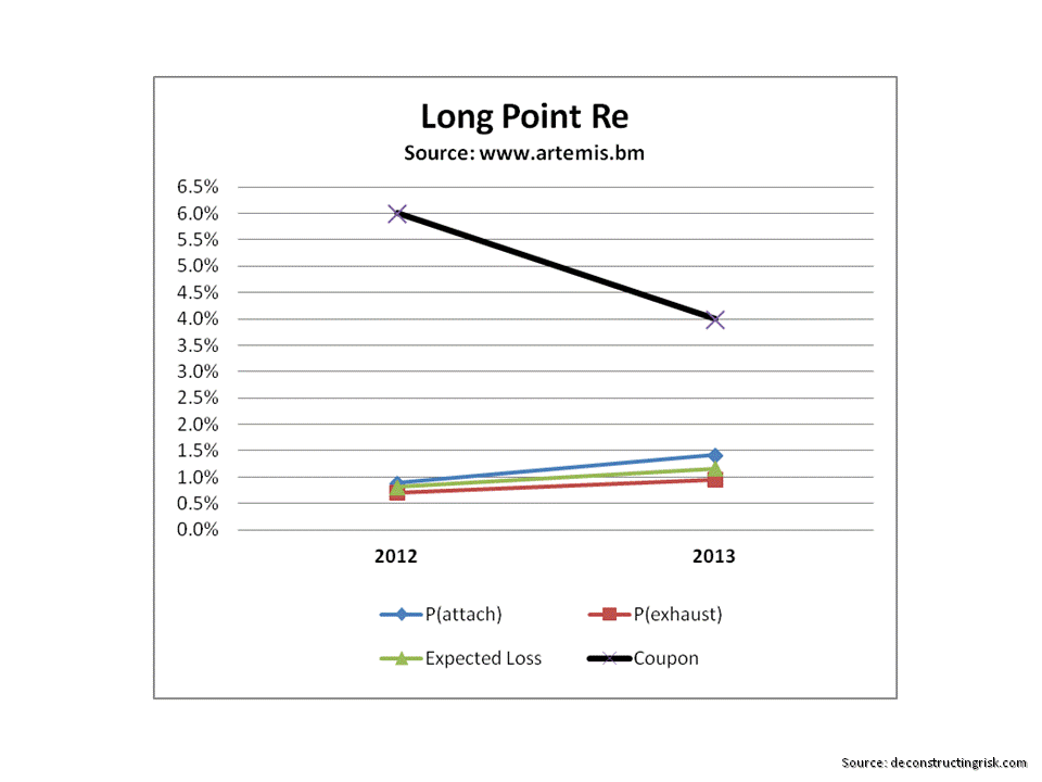 My analysis shows that currently investors should only make a loss on this “average” portfolio once every 4 years (i.e. 25% of the time). Back 5 years ago, I estimate that probability at approximately 17% or roughly once every 6 years. If pricing deteriorates further, to the point where net premium is equal to the aggregate expected loss on the portfolio, that probability increases to 36% or roughly once every 3 years