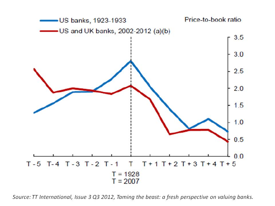 Historical P to TBV Reinsurers & Wholesale Insurers 2001 to 2013Over the past 12 months the sector has broken out of the downward trend across the financial services sector following the financial crisis, most notably in the banking sector as the graph below from TT International illustrates.