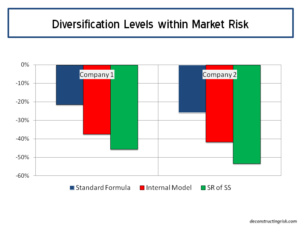 Assumed diversification within each risk type can also be material. Although I can understand arguments on underwriting risk types given different portfolio mixes, it is hard to understand the levels assumed within market risk, as the graph below on the disclosed figures from two firms show. Its hard for individual firms to argue they have material differing expectations of the interaction between interest rates, spreads, property, FX or equities!