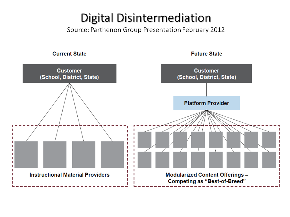 One important development that will determine the future success of firms such as HMHC is the newly developed Common Core State Standards agreed by State governors with implementation scheduled to begin in the 2014-2015 school year. Some, such as HMHC, argue that the long established firms with proven content and relationships will benefit the most from such standardisation. Others see these new standards as offering newer firms the opportunity to compete and innovate. The Partheneon Group, in the presentation referenced above, contend that digital disintermediation offers multiple content providers the opportunity to see their products if a common framework can be established, as the graphic below shows. Firms like Apple and Google are active in the education sector and would love to position themselves as such a platform.