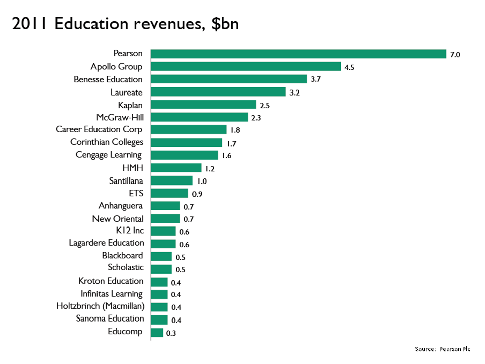 The firms above are from a cross section of the industry, some focus on adult education, others on universities, whilst others on the K-12 market. The main firms in the K-12 sector are Pearson Education, McGraw Hill Education, HMHC, Cengage Learning, Scholastic Corporation and K12 Inc.