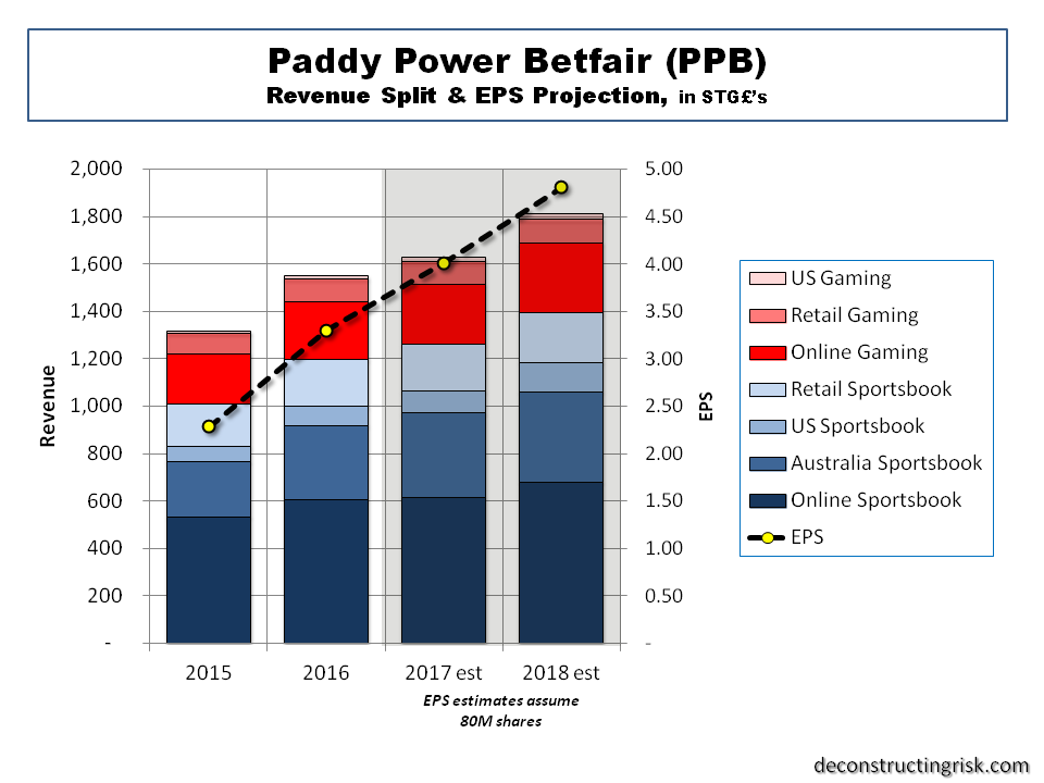 Despite the firm putting reduced net revenue margins primarily down to unfavourable sports results (increased promotion costs also contributed, doing things like paying out on Hilary Clinton prior to the actual election results doesn’t help!), the worry is that competitive pressures rather than bad luck are resulting in reduced net revenue and gross win margins. [Net revenues are gross wins less VAT and fair-value adjustments for free bets, promotions and bonuses]. Care needs to be taken when comparing gross win margins (i.e. gross win divided by amounts staked) and net revenue margins across firms as the make-up of the underlying portfolio is important (e.g. gross wins varies by sport type such as football, horses, tennis, etc and by geography) and firms may account for certain items differently. Also, the absence of the largest online player, the privately owned Bet365, makes industry analysis difficult for amateurs like me.