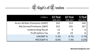 So, what does the above graphic illustrate? Accepting the (vast) limitations of my simplistic analysis, it indicates that the market today is at a similar stage in the rate cycle as we were in 2007 and 2014 (I would discount the 1990’s as the wild west in terms of London market underwriting behaviour). However, as highlighted by Beazley CEO Adrian Cox “in contrast to the previous softer cycle, there is a fundamental difference in today’s environment; the claims environment is active in respect to both frequency and severity, and uncertainty is elevated”. In the 2007 and 2013 years and the years that followed each, insured CAT losses were relatively low which fed the subsequent declines in rates. The CAT losses of 2011 and 2017 represented the bottom of each of the soft cycles albeit that the peak of 2012 and 2013 were short lived and it took a full 5 years over 2018 to 2022 for rates to get to an “adequate” level again.