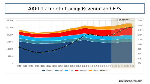 This valuation is despite the risks that exist for AAPL. Navigating the full impacts of the COVID recession on employment and incomes is the obvious headwind. Other current risk includes potential pressure on margins from 5G phones, potential China disruptions from geopolitical tensions between the US and China (e.g. wechat ban), and potential pressure on apple store margins from developers (e.g. fornite/epic quarrel).