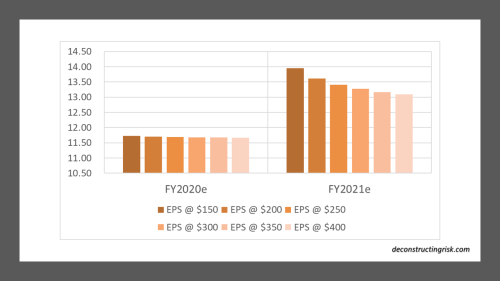 For the next 6 quarters to the end of FY 2021, I am assuming they return to shareholders, through both dividends and buy-backs, a similar amount of $126 billion to the previous 6 quarters, $105 billion through buy-backs alone. This shareholder return in terms of free cash-flow earned over the next 6 quarters would be an eye popping 200% according to my estimates. I further estimate a reduction in net cash on the balance sheet to approximately $40 billion by the end of FY 2021, an amount which I believe management, to be consistent with the firm’s DNA, should not feel comfortable going below for prudence sake (or to avail of further accretive M&A opportunities). One of the lessons of the COVID19 outbreak for well managed firms is surely the need for a contingency buffer against the unexpected. The resulting impact upon diluted share count and EPS of these assumptions at differing average buy-back share prices is shown below.