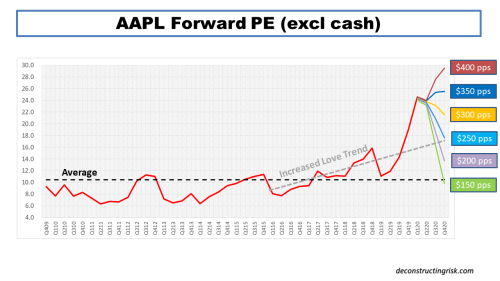 So, that just leaves the question of valuation. I will again warn that the subject matter in this post is based upon my assumptions which are highly speculative. I have proven myself to be hopelessly wrong in relation to AAPL at certain points in the past, so this time is unlikely to be any different! Using my preferred forward PE multiple excluding cash per share methodology, the graph below shows the forward multiples of my assumed performance over the next 6 quarters at share prices from $150 to $400, in increments of $50. The “increased love trend” is reflective of the higher multiple that AAPL has received as their service business has expanded and the hybrid hardware/software valuation has evolved.
