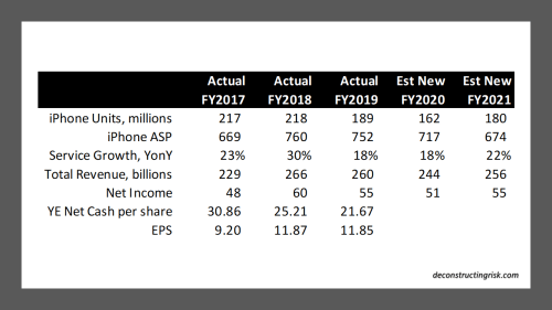 For my projections, I have assumed 26 million iPhone sales in the current quarter, down 27% on 2019, and 162 million for FY 2020, a 14% reduction from FY 2019. For FY 2021, I have assumed a pick-up in yearly unit iPhone sales due the launch of 5G iPhones, some in time for the holiday season, but at 180 units for FY 2021 it’s far short of the anticipated super-cycle refresh due to depressed consumer demand as the recession plays out next year. My assumptions are shown below: