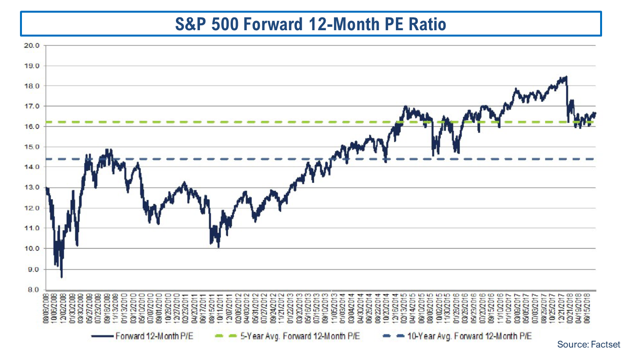 According to Factset as at 10/08/2018, the 12-month forward PE of 16.6 is around the 5-year average level and 15% above the 10-year average, as below. As at the S&P500 high on 21/08/2018, the 12-month forward PE is 16.8.